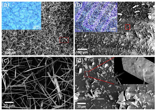 SEM images of (a) as-grown α-MoO3 nanoribbon network on SiO2/Si interdigitated substrate and (b) sulfurized α-MoO3 nanoribbons. Insets in (a,b) show corresponding optical micrographs. High-resolution SEM images of (c) as-grown α-MoO3 and (d) sulfurized α-MoO3. The inset in (d) is a magnified view of an individual sulfurized MoO3 nanoribbon (reproduced from [102], MDPI, 2022).