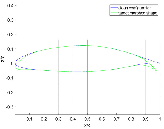 The target morphed shape produces the lift coefficient illustrated in the plot of Figure 4 together with the one in the clean configuration.