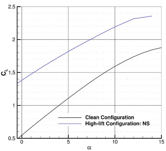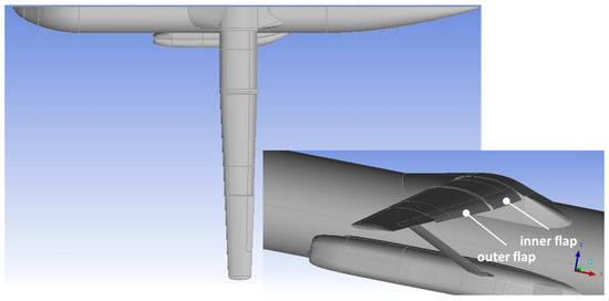 This augmented high lift is produced by the aerodynamic configuration shown in Figure 2, suited for the truss-braced wing sketched in Figure 3 and aimed at significantly enhancing the lift capacity of an aircraft, particularly during critical phases of flight, such as take-off, landing, and low-speed maneuvering. It is achieved through advanced design features that optimize airflow, minimize drag, and adapt the aerodynamic profile dynamically. To this scope, the SU2 open-source RANS flow solver was used [45]. Two flaps contribute to generation of the high lift, namely the inner and outer flaps (Figure 3).