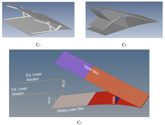 As mentioned, the first architecture investigated, namely C1 (Figure 5, top left), is a truss rib configuration composed of a one-piece composite morphing skin and equipped with a lower strip portion capable of sliding in the chordwise direction under the action of a linear actuation system [46]. Two morphing ribs, with selective stiffness truss elements properly attached to the skin, allow the morphed-down activation under the actuation loads action.