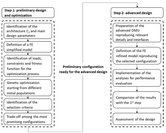 The development of the above-mentioned C3 concept was addressed by means of the FE approach. As shown in Figure 6, the process was split in two main steps: a first step devoted to the identification of the main design parameters of the architecture and its optimization and a second step focusing on the advanced design and on the validation of the results previously obtained. The FE simulations were addressed by means of the MSC NASTRAN 2024.1 solver; the FEMAP v11.3.2 pre- and post-process software were also used to realize, analyze, and present the results for both the simplified and advanced models. To assure an adequate level of detail, the DMU of the advanced design was realized by means of the CATIA v5 CAD software. Finally, the optimization was addressed by means of an in-house genetic algorithm in the MATLAB R2020b environment.
