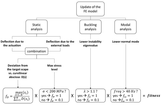 The design and optimization of the system was carried out through a genetic algorithm. The core of the algorithm was defined to estimate the functionality and the load absorption capability of a generic layout of the morphing device. For each configuration processed by the algorithm, the flowchart shown in Figure 7 was implemented. It describes the following: