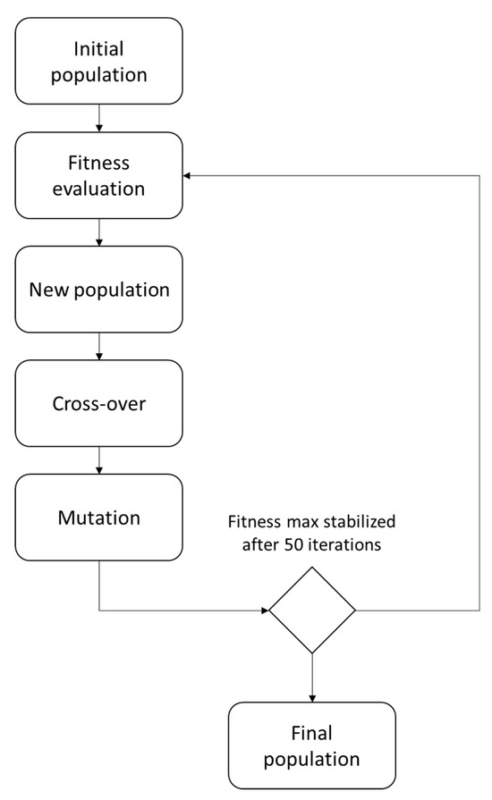 The above-mentioned in-house genetic algorithm was used [47]. As shown in the flow chart of Figure 9, an initial population is randomly generated. Each individual is defined by a layout of a certain typology plus the thickness distribution of the skin and the web. Each geometric and thickness property constitutes a single chromosome of the individual. A first fitness evaluation is performed using the core scheme discussed above. On this basis, a classification is built. Then, a new population is created privileging the individuals with the higher fitness but at the same time not discharging the lowest one; a crossover operation is executed, randomly exchanging 50% of the chromosomes between individuals. At this point, to avoid any premature convergences, a mutation, i.e., the random alteration of some parts of the genetic heritage of some individuals, is also performed. The new population is again processed to find the current fitness distribution. These steps (crossover, mutation, fitness evaluation, and assessment of a new population) are repeated until, after 50 iterations, no increase in the maximum fitness value is observed. More optimization processes were repeated, starting from different initial populations to further avoid the risk of premature convergences and to address a final trade-off among the best individuals.