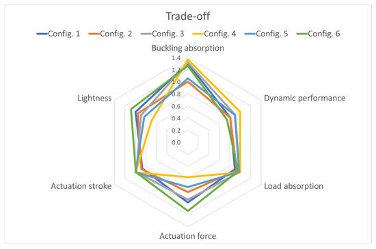 Other parameters were not included in the optimization loop: the structural weight and the actuation force and stroke. Since the chosen layout is already characterized by an intrinsic lightness and simplicity, the weight parameter was relaxed in favor of the robustness, thus yielding a wider range of solutions. Finally, with the intention of focusing on the compliant part of the system, the actuation features were not considered in this phase; however, a preliminary sensitivity study on the present layout confined the force and stroke of the actuator within a reasonable range compliant with the requirements. Then, it is worth noting that weight and actuation force and stroke impact were considered in the trade-off phase organized among the optimized solutions that confirmed the assumption on the ranges.