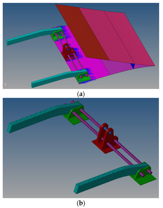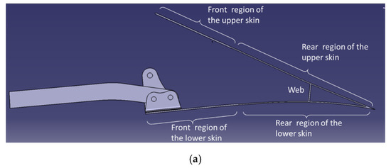 The compliant trailing edge investigated in this work is constituted by an upper and lower skin panel with a stepwise variable thickness. As shown in the bottom scheme of Figure 5, a web element connects these two panels for cooperation in absorbing loads. The thickness distribution of the skin parts and the web and the position of the web itself is the result of a good compromise among different requirements in terms of structural integrity, lightness, shape preservation under the external actions, and approaching the target morphed shape shown in Figure 2.