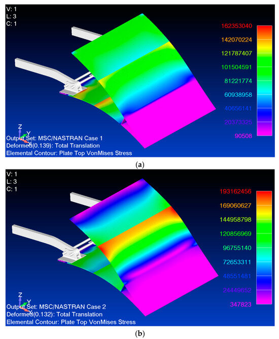 Despite the above-mentioned advantages, some critical aspects must be discussed. First is the stress accumulation due to the compliant nature of the system [46], to which some regions seem particularly critical, such as the clamp of the upper skin, the web connections, and the sliding region on the lower skin. An accurate design must accomplish the stress mitigation task for these parts to assure an adequate safety and fatigue life. Another crucial aspect is represented by the actuators; since, in this specific layout, the actuation must cooperate with the structure in absorbing loads, any fault would have a potential impact not only in terms of functionality but also in terms of structural integrity. In addition, the sliding track system must be carefully sized to avoid both friction/jamming issues and the triggering of unwanted vibratory phenomena. Last but not the least is the instability. Although the sliding mode of the lower skin prevents any instability relevant to the shortening of the skin, its rigidity and the layout must together assure an adequate behavior under the external loads avoiding collapse while keeping the desired shape.