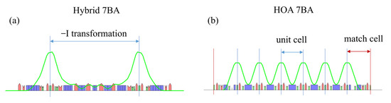 Schematic diagram of the MBA lattice structure (assuming M = 7, M represents the number of bending magnets in one cell) and dispersion function (green line) trend of (a) hybrid 7BA and (b) HOA 7BA. The blue rectangles in the figure represent the dipoles, the red polygons represent quadrupoles, and the green polygons represent sextupoles.