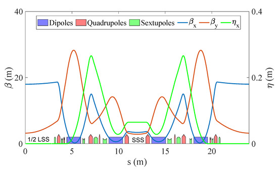 In order to achieve a low natural emittance while maintaining a high straight section ratio, we adopted the double double-bend achromat (DDBA) lattice [26], which has four bending magnets per cell and provides an additional straight section in the middle of the arc. The storage ring has an energy of 3 GeV and a circumference of 288 m, with a total of 12 cells. Each cell contains a long straight section (LSS) of 6.20 m and a short straight section (SSS) of 1.86 m, allowing for the accommodation of more insertion devices (IDs). A standard 24 m cell contains main magnetic elements including four dipoles, ten quadrupoles and ten sextupoles. Six sextupoles are located within the dispersion bump for chromaticity correction and four harmonic sextupoles are located in the dispersion-free region to optimize its nonlinear performance. Figure 3 shows the linear optics of the DDBA cell, and the main parameters of the storage ring are presented in Table 1.