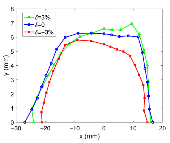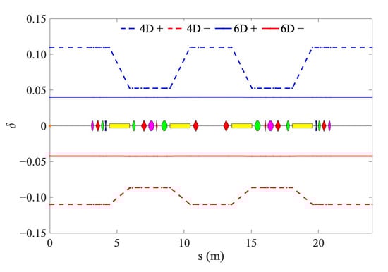 Figure 6 demonstrates the tune shift with momentum deviation ranging from −8% to 8%. It can be seen that the vertical tune of the lattice crosses the half-integer resonance when the momentum deviation approaches −8%. Combined with the FMA results of off-momentum shown in Figure 7, it can be observed that no particle loss occurs when crossing the half-integer resonance [30], indicating that the lattice has good momentum acceptance and excellent off-momentum dynamics. We also performed 4D and 6D tracking for the local momentum aperture (LMA), and the results are presented in Figure 8. It can be seen that the 4D LMA is very large, with a momentum acceptance of approximately 11% at the injection LSS. However, the 6D tracking of the LMA is limited by the RF acceptance, which is approximately 4%. Such a large LMA is very favorable for the beam’s Touschek lifetime [31], and we will discuss the Touschek lifetime of the beam after considering the IBS effect in the next section.