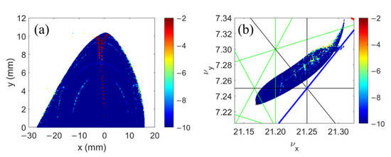 where Δνx and Δνy are, respectively, the differences in x and y tunes from the first and second half of the tracking, and N is the number of turns. And a smaller Dr indicates more stable particle motion. Figure 5 displays the results of FMA, where particles were tracked for 1024 turns, and Dr was calculated based on the tunes from the first 512 turns and the last 512 turns. In Figure 5b, resonance lines up to the fifth order are plotted, with the blue lines representing second-order resonances, red lines representing third-order resonances, black lines representing fourth-order resonances, and green lines representing fifth-order resonances. From Figure 5b, it can be found that the particles do not cross any potentially dangerous resonance lines, which indicates that the lattice has good nonlinear dynamics performance.