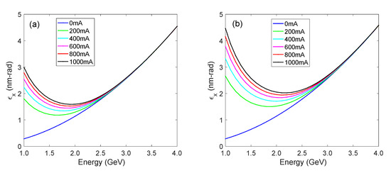 Equilibrium emittance versus beam energy for different beam currents at (a) 1% transverse coupling; (b) 0.1% transverse coupling.