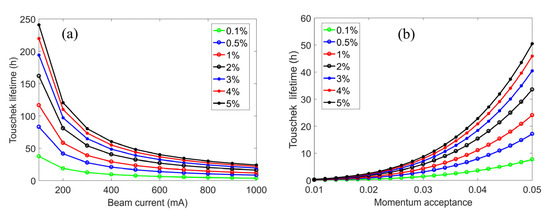 Touschek lifetime versus beam current for different transverse couplings (a); Touschek lifetime versus momentum acceptance for different transverse couplings (b).
