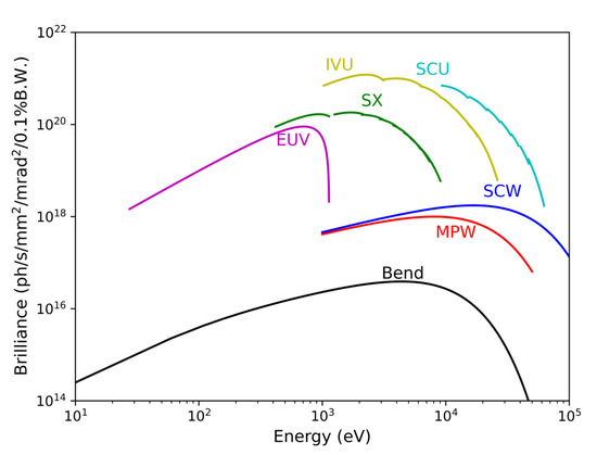 Initially, five types of insertion devices (IDs), which include in-vacuum undulators (IVU), multiple wigglers (MPW), APPLE-II type elliptically polarized undulators (EPUs), superconducting (SC) wigglers, and SC undulators, will be adopted to cover the whole energy range from extreme-ultraviolet (EUV) to hard X-ray. The typical parameters of these IDs are summarized in Table 3. Brilliances of these IDs, calculated using the code SPECTRA [35], are shown in Figure 11. The brilliance of third-generation storage rings is typically in the order of 1020 ph/s/mm2/mrad2/0.1%BW, and the brilliance of the DLSR is normally in the order of 1022 ph/s/mm2/mrad2/0.1%BW. From Figure 11, it can be seen that the design in this paper can reach the 1021 ph/s/mm2/mrad2/0.1%BW, which is between the third-generation storage rings and the DLSRs.