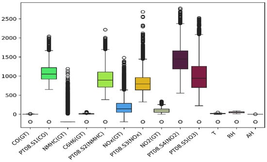 Several metal oxide chemical sensors installed in an air quality chemical multisensor device provided 9357 samples of hourly averaged responses, which comprise the dataset [15]. In a highly polluted area of an Italian city, the instrument was positioned at street level. The information was accessible between March 2004 and February 2005. A reference certified analyzer at the same site provided the ground truth hourly average concentrations of CO, non-methane hydrocarbons, benzene, total oxides of nitrogen (NOx), and nitrogen dioxide (NO2). The variables in the dataset and the boxplot showing the initial value distributions of each of them are presented in Figure 1.