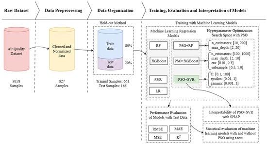 This study aims to improve the performance of machine learning regression algorithms in air quality prediction by hyperparameter optimization with particle swarm optimization (PSO). Two main approaches are proposed in this study. In the first approach, the dataset is preprocessed. This preprocessing process includes min-max normalization and removal of missing (null) data from the dataset. Then, the preprocessed dataset is prepared for use in both approaches. After this stage, prediction is performed using XGBoost, support vector machine (SVM), linear regression, and random forest (RF) regressors. The performance of each algorithm is evaluated using metrics such as RMSE, MSE, MAE, and R2 and the results are reported. Additionally, statistical analysis is performed using t-test. In the second approach, hyperparameter optimization is performed for each regression algorithm using PSO. MSE (mean squared error) is used as the objective function of PSO. For this purpose, the parameters of PSO (number of particles, learning rate, etc.) are empirically determined and optimized to improve the model performance. Then, the same metrics (RMSE, MSE, MAE, R2) are calculated for these optimized models and the results are compared. In terms of the model validation process, the dataset is separated by the holdout method in both approaches. It is ensured that no data leakage occurs between the training and test data, thus the generalizability of the model is tested more robustly. This method avoids the risk of overfitting and increases the reliability of the results. Finally, SHAP analysis is performed to show which features are effective in the best performing model and to what extent. This analysis is used to explain the predictions of the model and to visually assess which inputs are more important. The general pipeline of the proposed method is illustrated in Figure 2.