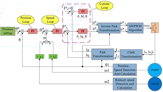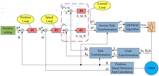 As shown in Figure 4, is the position setting of the main controller, is the position sampled from the motor encoder, and ω is the speed calculated from the motor encoder position. is the output of the position loop and also the set value of the speed loop. is the set value of the q-axis current loop, and is the set value of the d-axis current loop.