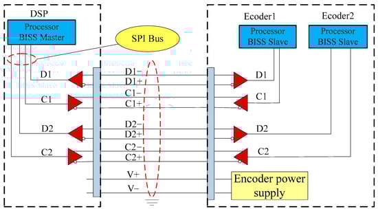 The DSP sends a read signal via the serial peripheral interface (SPI) bus, and with the two SPI peripheral modules of the DSP, it can sample data from two encoders simultaneously. Upon receiving the read signal from the DSP, the encoder synchronously returns the data to the SPI bus. The DSP parses the returned data signal and extracts the encoder’s single-turn value, alarm value, and other relevant information. As shown in Figure 5, D1 is the data transmitted from encoder1 to DSP, C1 is the clock signal sent from DSP to encoder1, D2 is the data transmitted from encoder2 to DSP, C2 is the clock signal sent from DSP to encoder2, D1+ and D1− are the differential signals transmitted from encoder1 to DSP1, and C1+ and C1− are the differential signals transmitted from DSP to encoder1. D2+ and D2− are differential signals transmitted from encoder1 to DSP1, while C2+ and C2− are differential signals transmitted from DSP to encoder1. DSP can convert differential signals into single-ended signals or vice versa through the SN65HVD77D transmission chip. The BiSS encoder employs a cyclic redundancy check (CRC) to ensure the accuracy of data received by the DSP. If the CRC checksum calculated by the DSP is equal to the checksum sent by the encoder, then the received encoder data are accurate. Otherwise, encoder data that have not passed the verification are considered incorrect. In the design phase, it is recommended that the number of encoder check errors be displayed for operators to analyze. The schematic design was further optimized to enhance signal integrity and improve noise immunity. This was achieved through a strategic signal conversion approach: initially converting single-ended signals to differential signals and subsequently reconverting them back to single-ended signals at the receiving end. This configuration ensures that the extended transmission path utilizes differential signaling, thereby significantly improving the system’s immunity to electromagnetic interference (EMI) and common-mode noise. The differential signaling implementation during the critical transmission phase provides inherent noise rejection capabilities, while the single-ended conversion at both ends maintains compatibility with standard interface requirements.