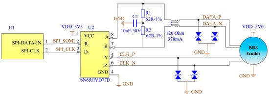 In Figure 6, U1 is the DSP. As the encoder is a serial communication signal, the DSP receives Transistor–Transistor Logic (TTL) levels and a communication level conversion chip is required. U2 is a Full-Duplex RS-485 Transceiver SN65HVD77D, which can convert single-ended signals and differential signals to each other. In the encoder data reading circuit, the DSP generates an SPI clock. The 62 ohm resistor connected in series on the SPI signal is mainly used for impedance matching, reducing signal reflection, minimizing overshoot, and facilitating debugging. The 120 ohm common mode inductor is used to suppress common mode noise and improve communication reliability and anti-interference ability. The transient voltage suppressor shown in the diagram enhances the anti-interference capability. The BiSS encoder is powered by 5 VDC. The motor will generate significant interference signals. To enhance anti-interference capability, in practical applications, the signal lines of the encoder should be kept as short as possible and connected in a twisted pair configuration [].