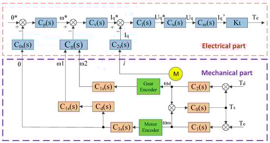 Cv(s) is the velocity regulator with a transfer function of PI control. The proportional gain and integral time constant are denoted as Kvp and Tvi, respectively []. Therefore, its expression can be formulated as