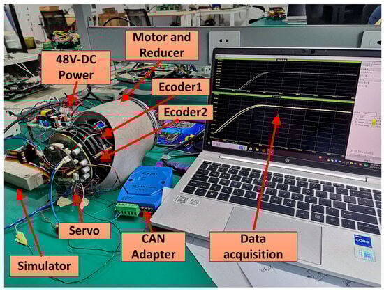 Figure 9 shows a single joint test scenario of a collaborative robot, where the motor and reducer are integrated inside the joint, the servo is installed on the outermost side, the 48VDC power supply is used to power the system, encoder1 is installed on the motor side, and encoder2 is installed on the reducer side. The simulator is used for program download and hardware simulation, and the CAN adapter is used to transmit data to the computer for data analysis, and waveform diagrams can be drawn.