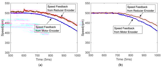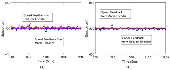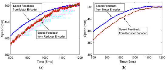 The speed control waveforms in the steady-state phase. (a) Without the reducer-side encoder involved in the control; (b) with the reducer-side encoder involved in the control.