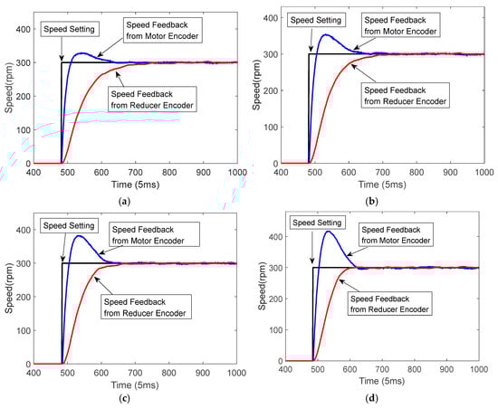 When the speed measured by the reducer side encoder is incorporated into the control system, the fluctuations in the reducer side speed are significantly improved during the startup phase, as shown in Figure 10b. This improvement is attributed to the decrease in the control coefficient k1 of the motor side encoder and the increase in the control coefficient k2 of the reducer side encoder. It is normal to observe an overshoot at the encoder-side speed. The red line represents the speed feedback from the motor side encoder, while the blue line indicates the speed feedback from the reducer side encoder.