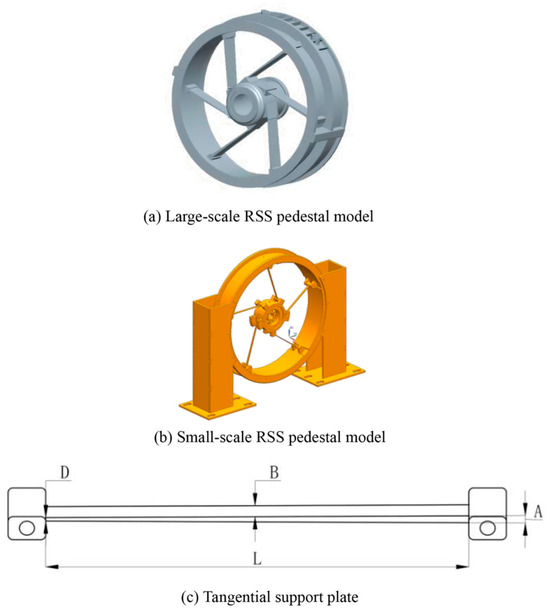 The large size of heavy-duty gas turbines makes the modeling and measurement of the actual model quite difficult. Therefore, this study was conducted based on a simplified version of the heavy-duty gas turbine model. Initially, through the study of relevant materials, the detailed dimensions of the large RSS base were determined, and a 3D solid model with five tangential support plates suitable for laboratory conditions was built using UG software (NX12.0), as shown in Figure 1a. Considering the high computational demands of mesh division and post-processing operations, the RSS base 3D model was simplified to reduce both computation time and hardware requirements while maintaining modal analysis accuracy by eliminating non-essential features, like fillets and chamfers [29]. The 3D solid model of the RSS base containing five tangential support plates suitable for laboratory conditions is shown in Figure 1b, with the tangential support plate shown in Figure 1c. The key dimensions include plate length (L), thickness (D), angle (A), and width (B).