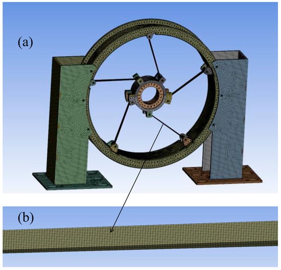 Finite element model of pedestal. (a) Overall mesh division of the RSS base; (b) magnified details of the tangential support plate.