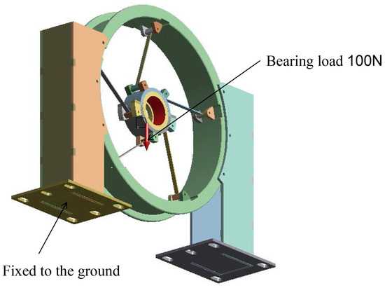 Static characteristics have a substantial impact on manufacturing precision, and static stiffness is a crucial reference for assessing static properties [30]. The connection method at the interfaces must be carefully considered during finite element analysis. Due to the complexity of the actual installation and fixation of the RSS base and considering computational resource constraints, the tangential support plate is the most dynamic component in the RSS base [31]. Therefore, this study emphasizes the optimization analysis of the structural parameters of the tangential support plate to alleviate computational load. Fixed constraints were imposed on the RSS base bottom plate, with all components bound together. Based on past experience, the weight of components needs to be estimated when applying bearing loads. According to the relevant dimensions of our model and the selected materials, we estimated that each base needed to bear a load of approximately 80 N from the shaft, balance disk, and sliding bearings. Following safety principles, a safety margin was included, so a bearing load of 100 N was applied at the bearing support location. In practice, the base of the machine is bolted to the ground, so in the modal analysis setup, the bottom surface of the base must be fixed with constraints. In conclusion, the loads and conditions applied to the RSS base finite element model are depicted in Figure 3.