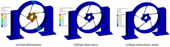The static analysis of the RSS base forms the basis for its modal analysis. The relevant data dimensions of the Changshan M701F4 gas turbine provided by Dongfang Turbine Works (Deyang, China) are A = 1.02°, B = 240 mm, D = 11.75 mm, and L = 1403.75 mm. After equal proportion reduction and optimization, the preliminary dimensions for the tangential support plate design are A = 1.02°, B = 11.5 mm, D = 3 mm, and L = 150 mm. Under these conditions, the deformation, equivalent stress, and equivalent elastic strain of the RSS base are presented in Figure 4.