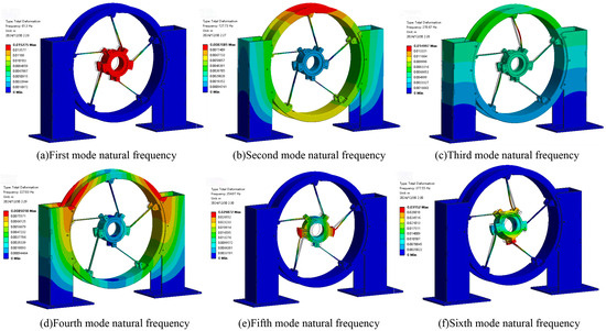 Vibration theory indicates that higher-order modes have minimal contribution to the dynamic response and decay rapidly, so only low-order modes need to be considered [32]. Modal analysis of the RSS base was performed using ANSYS Workbench, extracting the first six natural frequencies and mode shapes of the rotor through the Block Lanczos method. The complete mode shape contour diagram is shown in Figure 5, with the natural frequencies and mode shapes described in Table 2.
