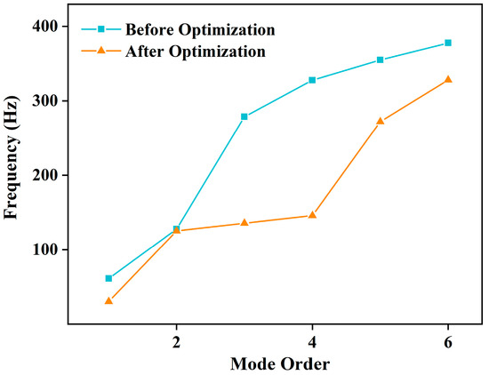 The optimized dimensions of the support plate are A = 0.507°, B = 7 mm, D = 1.5 mm, and L = 169.22 mm. Modal analysis of the optimized support plate base model was performed, and the comparison with the original model is shown in Figure 6. From Figure 6, it can be seen that after optimization using the equivalent static load model, the first to sixth modal natural frequencies of the RSS base became 30.34 Hz, 125.33 Hz, 135.75 Hz, 145.89 Hz, 272.17 Hz, and 328.08 Hz, respectively. It is clear that the modal natural frequency values of the optimized support plate are lower than the pre-optimized model, with the first-order natural frequency being 30.34 Hz. This meets the condition that the first-order natural frequency is lower than the operating frequency and well away from the resonance frequency. It confirms the dynamic transformation of the base model from rigidity to flexibility and validates the effectiveness of the optimization using the equivalent static load model.