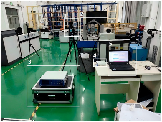 The layout and connections of the experimental apparatus are depicted in Figure 8, including the following critical components: an SOPTOP laser head (Zhejiang Sunny Optical Intelligence, Yuyao City, China) (1), responsible for emitting and receiving the laser beam; an RSS base (2), equipped with a reflective film and serving as the measurement object in this study; a laser Doppler vibrometer LV-S01 control box (Zhejiang Sunny Optical Intelligence, Yuyao City, China) (3), used for data processing; a Ni USB 4431 acquisition card (NI [National Instruments Corporation], Austin, TX, USA) (4), with 24-bit resolution and a synchronous sampling rate of 102 kS/s; and a computer system with Quick SA 4.0 (5). The SOPTOP laser head was aligned with the reflective film on the RSS base. Adjustments were made to stabilize the energy of the laser head, which was then connected to the LV-S01 control box. A signal transmission line was used to connect to the Ni USB 4431 acquisition card, through which the excitation and response signals were transmitted into the card, and ultimately, another transmission line connected to the computer.