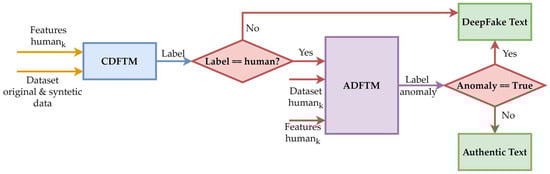 The characteristics analyzed by the models will be called features. Figure 1 presents the conceptual diagram of the two models. The output of the models is defined as a label. In Figure 1, the analysis of a text associated with the human k is evaluated as input. CDFTM receives the text characteristics, and the model is trained using the dataset that allows differentiation between AI or human text data. If the model’s output is human, then ADFTM will analyze the dataset associated with human k and compare it to human k’s features.