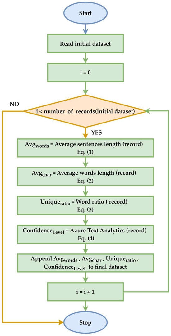 Texts from the source [] were added to this collection to create an even larger dataset. This resulted in a dataset containing 1300 records. Of these, 650 are deepfakes, while the remaining 650 are human-generated. The initial dataset contains texts of different sizes and addresses various topics. These texts are processed according to the algorithm illustrated in the logical schema in Figure 2. The conversion algorithm of the initial dataset into the final dataset was implemented in C#.