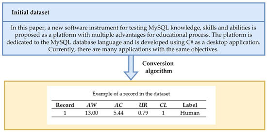 Figure 3 shows an example of converting an original text into a record to be associated with the final dataset used to train the model, as analyzed in the following sections. Thus, 13.00 is AW, 5.44 is AC, 0.79 is UR, and 1 is the CL.