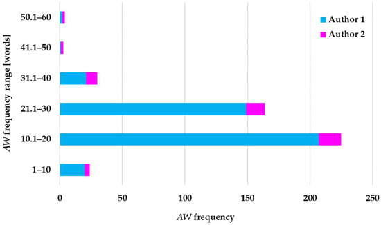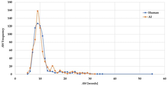 Figure 4, Figure 5, Figure 6 and Figure 7 present a statistical summary of the dataset. Figure 4 depicts the comparative trends of the AW frequency distribution at the sentence level between AI and humans. AI shows a broader distribution, with a significantly higher number of words in its sentences. The frequency of a larger number of words at the sentence level highlights AI’s use of a diversified vocabulary. Humans are more associated with sentences of 7–11 words, representing expressions of natural language.