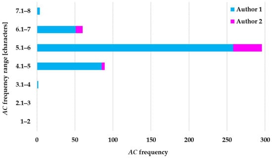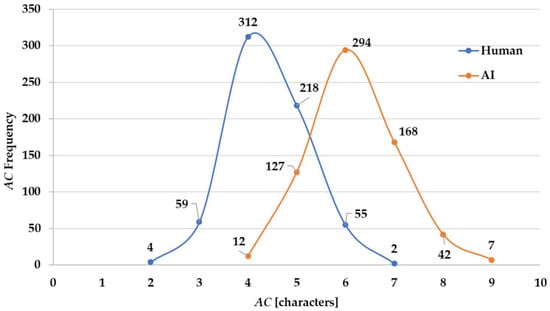 Figure 5 compares the AC frequency distribution between AI and humans. AI shows a higher frequency for long words (6 characters) and a tendency to use more complex words. This approach suggests a diversified vocabulary. In contrast, humans have a higher frequency of short words (4 characters). The simplicity of the vocabulary is characteristic of a more natural language. These differences suggest that AI uses a more sophisticated vocabulary than humans do.