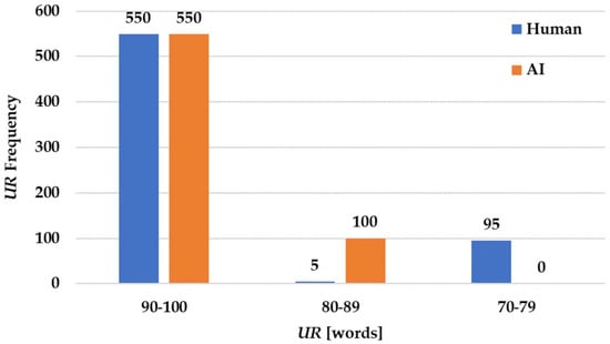 AI and humans both have a high frequency of words with a UR between 90–100%, suggesting a diversified vocabulary (Figure 6). However, humans show a higher ratio for the interval 70–79 than AI. These differences may indicate usage of a more varied vocabulary by humans, while AI uses a more concentrated vocabulary with more significant word repetition.