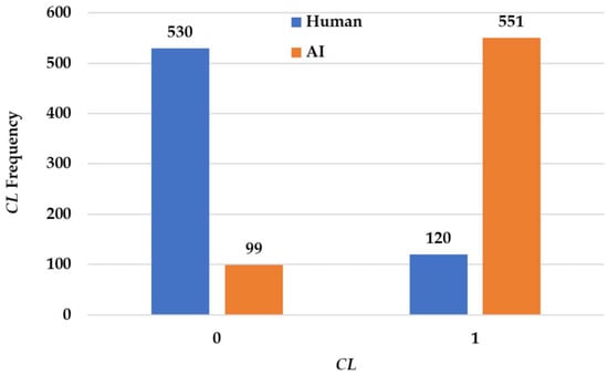 The sentiment analysis data from Azure show, as seen in Figure 7, a notable contrast between human and AI sentiment distributions. Humans generate significant positive and negative sentiments (530 instances with a score of 0), suggesting strong emotional responses. However, a smaller portion (120 instances with a score of 1) reflect neutral or mixed sentiments. Figure 7 demonstrates that AI has a greater balance, with a higher number of neutral or mixed sentiment instances (551 with a score of 1) compared to positive/negative ones (99 with a score of 0). This indicates AI’s tendency to produce more neutral responses than those produced by humans.