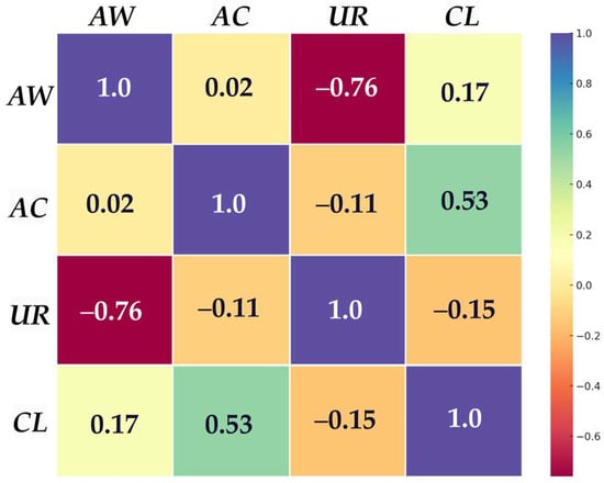 The dataset is then analyzed to determine whether there is a linear correlation. Figure 8 shows the feature correlation matrix for the deepfake text dataset. In this matrix, values of 1 indicate a perfect positive correlation, meaning a linear match between variables. Values of −1 indicate a negative linear correlation. A value of zero indicates the absence of a linear correlation between variables. By analyzing the values in Figure 8, it is found that there may be a negative correlation between AW and UR. This means that a higher number of words generates a lower uniqueness ratio. The other values indicate a lack of correlation. After analyzing this matrix, it was concluded that the model could not use a linear regression function.