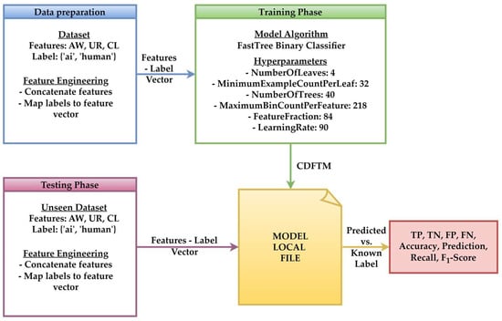 The model will analyze several specific ML algorithms: SdcaMaximumEntropyMulti, LightGbmMulti, LbfgsMaximumEntropyMulti, SdcaLogisticRegressionOva, LbfgsLogisticRegressionOva, FastTreeOva, and FastForestOva. MLDFR analyzes maximum entropy-based regression algorithms (SdcaMaximumEntropyMulti and LbfgsMaximumEntropyMulti), gradient boosting algorithms (LightGBM and FastTree), and logistic regression algorithms (SdcaLogisticRegressionOva and LbfgsLogisticRegressionOva). These algorithms use ML techniques for binary classification into “AI” or “Human”.