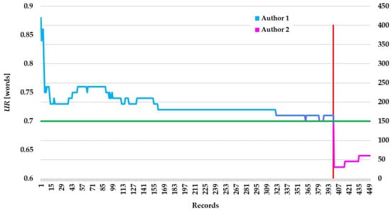 The ratio between the number of unique words and the total number of words in each record highlights the variety of words used and the frequency of word repetition (Equation (3)):