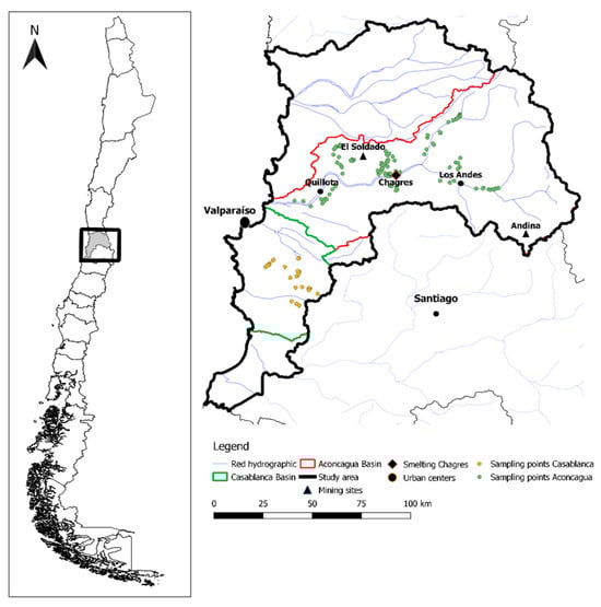 In the southernmost part of the region lies the Aconcagua River basin, an area of transverse valleys with a temperate Mediterranean climate with a prolonged dry season and high-altitude cold in the Andes Mountains [9]. This is the largest river basin in the Valparaíso region, with approximately 7300 km2 [10], inhabited by about 732,000 people [11], making it the most relevant hydrographic network in the central zone of Chile. Three main economic activities are observed in the basin: agriculture, mining, and the service sector [12]. This study focuses on the area’s mining activity, particularly mining operations [13].