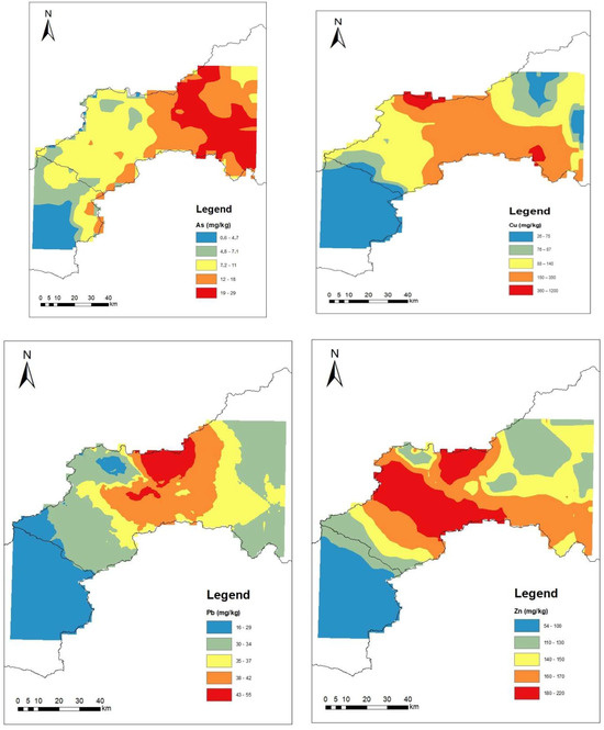 The kriging method using ArcGIS v.10.5 software was applied to show the spatial distribution of soil trace element concentrations. The software allows the user to locate each observed concentration geographically and to generate a map of hotspots to compare the distribution of different elements in the studied area [1]. This functionality was used to present the concentrations of As, Cu, Pb, and Zn using the ordinary Kriging method in ArcGIS version 10.5. In this study, several theoretical variogram functions, including linear, exponential, and spherical models, were evaluated. Table S3 presents the variogram parameters used for kriging modeling. The ranges were divided into 25th, 50th, 75th, 90th, and 95th percentiles using IBM SPSS Statistics v.21 software [18].