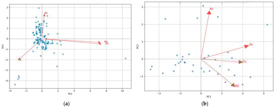 Principal component analysis (PCA) in the Aconcagua River basin reveals two components. Principal component 2 may be associated with the mining activities (Table 4a and Figure 3a), while PC1 appears to be influenced by both activities: mining and agriculture activities. Table 4b and Figure 3b present PCA results for the Casablanca River basin. Principal component 1 is likely related to agricultural activity, and PC2 is attributed to a geogenic origin.