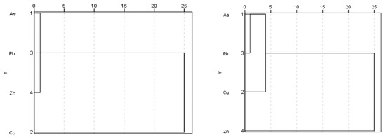 Cluster analysis plot for heavy metals As, Cu, Pb, and Zn (mg/kg) for the soils of the studied areas: (left) Aconcagua River basin and (right) Casablanca River basin.