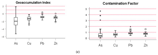 where is the measured concentration of the specific element in the soil (mg/kg), and is the background value (mg/kg). According to Loska et al. [24], the geoaccumulation index considers the seven classes indicated in Table S1.