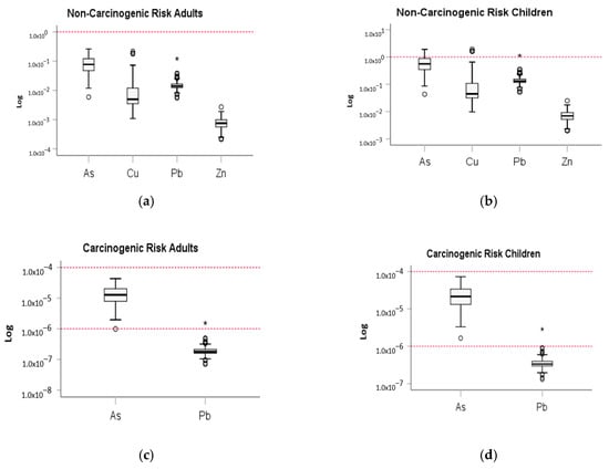 (a) Non-cancer risk in adults in the Aconcagua River basin, including mining activity. (b) Carcinogenic risk in children in the Aconcagua River basin, including mining activity. (c) Carcinogenic risk in adults in the Aconcagua River basin, including mining activity. (d) Carcinogenic risk in children in the Aconcagua River basin, including mining activity. The red dotted lines show the risk values. * Difference is significant at the 0.05 level.