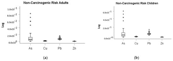 Human health risk assessment is a hypothetical basis for determining the probability of risks occurring to individuals after exposure to various hazardous elements [12]. Understanding the pathways and risks of trace metal exposure in contaminated soils, the distribution of their sources, and the physical differences between exposed individuals are fundamental prerequisites for preventing and controlling soil contamination [27]. This study considers three pathways of trace metal exposure: ingestion, dermal absorption, and inhalation, as well as whether the subjects are adults or children. Therefore, it is necessary to start by determining human intake through ingestion (DEing), dermal absorption (DEder), and inhalation (DEinh). Following the health risk assessment model proposed by USEPA [14] and USEPA [15], non-carcinogenic risk (HQ) and carcinogenic risk (CR) were evaluated for the elements As, Cu, Pb, and Zn. Copper toxicity is generally not an important concern for human health due to homeostatic mechanisms that control Cu excretion [16,17]. However, Bost et al. [19] argued that there are still unresolved issues regarding understanding the effects of Cu exposure on human health. It is important to note that HQ values < 1 indicate no significant risk of non-carcinogenic effects, while HQ values > 1 suggest that adverse effects may occur [18,28]. For cancer risk, values indicating no risk fall within the range of 10−6 to 10−4 [23], meaning that CR > 1.0 × 10−4 indicates a significant cancer risk to human health, while values below 1.0 × 10−6 suggest that the exposure is not harmful [24,25,26,29]. Only cancer risks associated with As and Pb have been evaluated in this study since USEPA has updated the slope factor values for these elements. USEPA [21] has not established slope factors for Cu and Zn, as standard values are still unavailable. The risks are evaluated and calculated according to Moreira et al. [25] as shown in the equations in Equation S2 and Table S3.